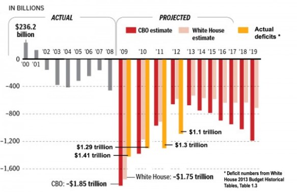 The above chart is doing the rounds – picked up on Instapundit in this instance – and shows that the deficit blow out most assuredly began with Obama who now prefers not to take the credit. The story in Australia would be even worse since the budgets all leading up to Labor taking over in 2007 were in surplus to go with our ZERO debt.