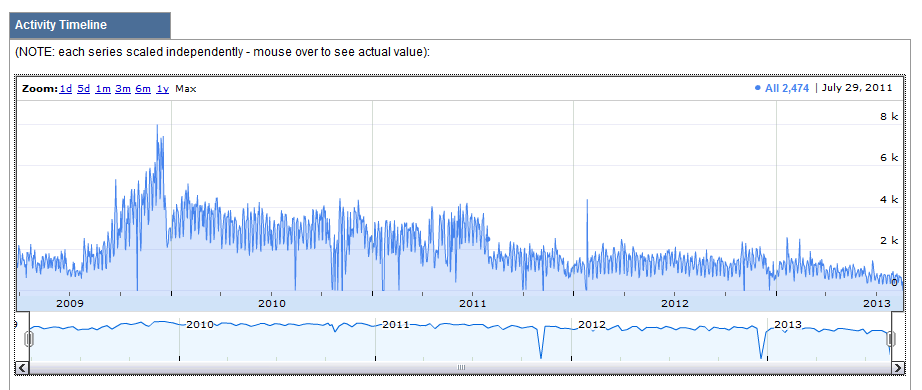 The Carbon Capture Report, based in Illinois, tallies up the media stories from the English speaking media on ‘climate change’ daily. Thanks to the tip from Peter Lang, we can see the terminal trend [above]. The big peak in late 2009 was the double-whammy of Climategate and Copenhagen (aka Hopenhagen). It’s all been downhill since then.