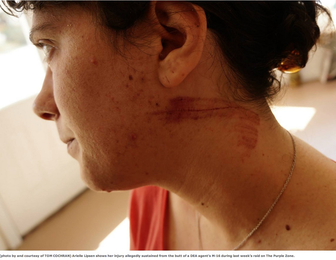 This is a photo of Arielle Lipsen (a good friend of mine) who was thrown to the ground and hit with the butt of a DEA agent’s rifle. She is now wrongfully being charged with assaulting a federal agent during a DEA raid of her sister’s smoke shop in Texas. Her sister gave the following statement to a local news site:
