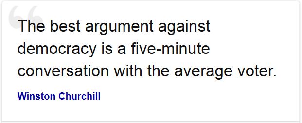 Ah yes, the worst system except for all the others that have been tried from time to time. But it is the same kind of elite opinion that today worries about climate change that once upon a time had Neville Chamberlain congratulating himself for achieving Peace in Our Time in 1938. Democracy at least has the benefit of making the majority complicit in their own downfall. Not much of a compensation, but it is something.
