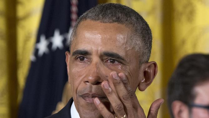 President Barack Obama wipes away tears from his eyes as he speaks in the East Room of the White House in Washington, Tuesday, Jan. 5, 2016, about steps his administration is taking to reduce gun violence. Also on stage are stakeholders, and individuals whose lives have been impacted by the gun violence. (AP Photo/Carolyn Kaster)