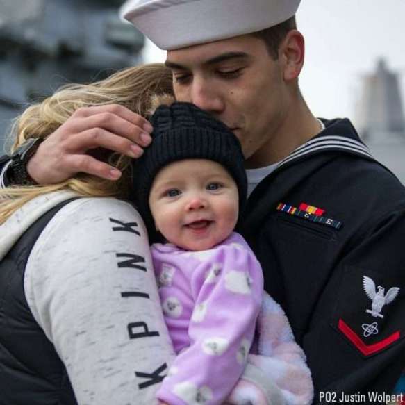 I LOVE THIS PICTURE SO MUCH: A sailor meets his child for the first time following the guided-missile cruiser USS Vella Gulf’s (CG 72) return to homeport.