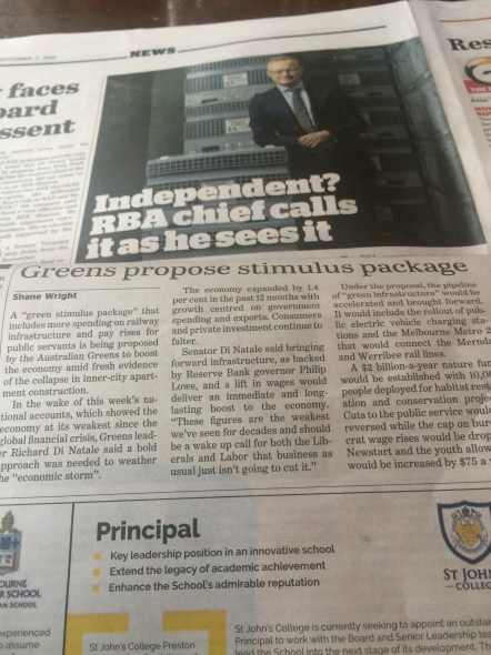 When you follow the story to its continuation on Page 6 we find that while the RBA Governor disagrees with the PM on the need for a stimulus, he does agree with The Greens.