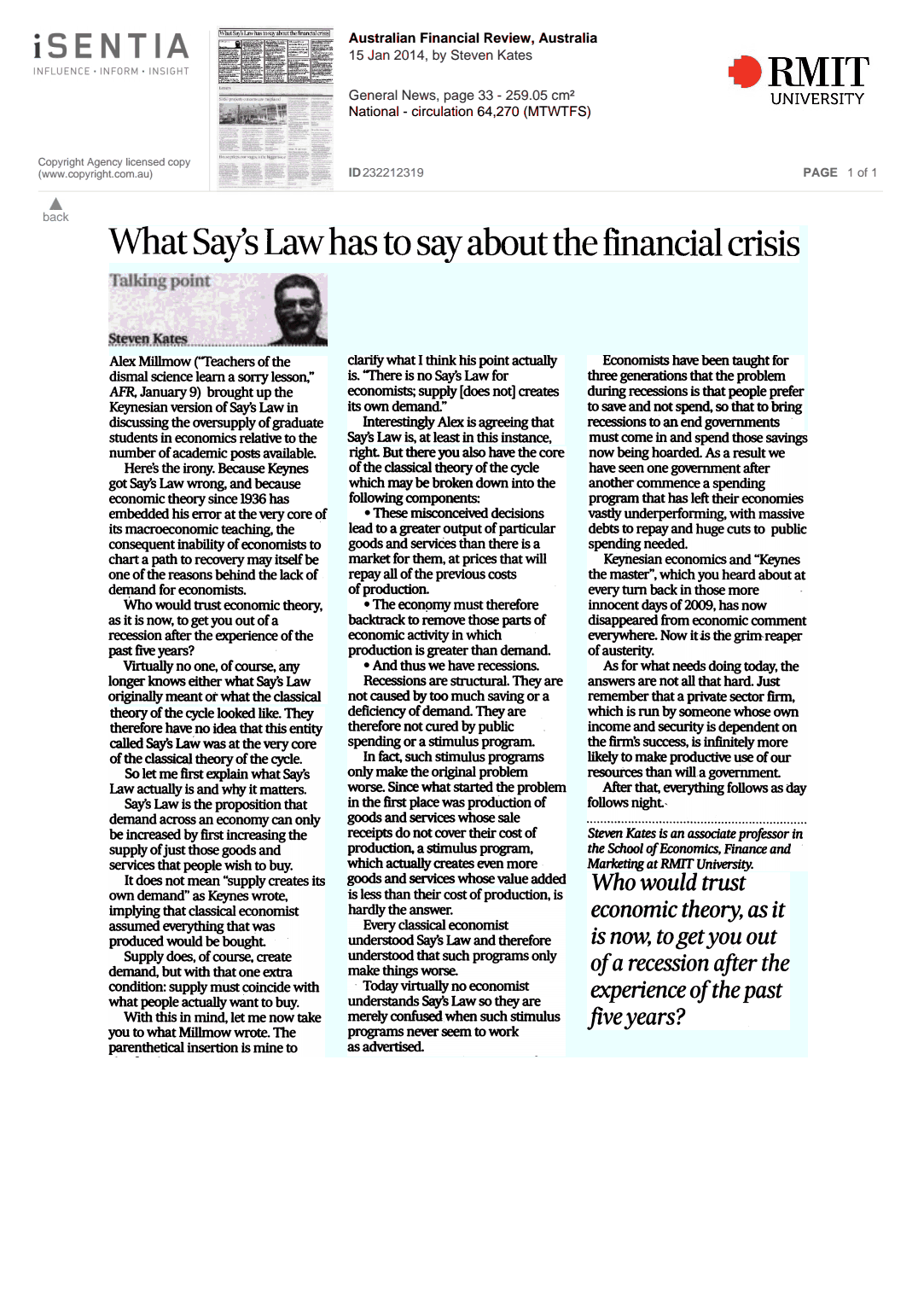 My likely final posting on this fascinating thread that began with my bring up Francois Hollande’s pointed comment on Say’s Law. The interesting thing for me to have seen in this instance is that others study the business cycle and find Say’s Law invisible. I began from examining Say’s Law and found its concepts an intrinsic part of the theory of the cycle.